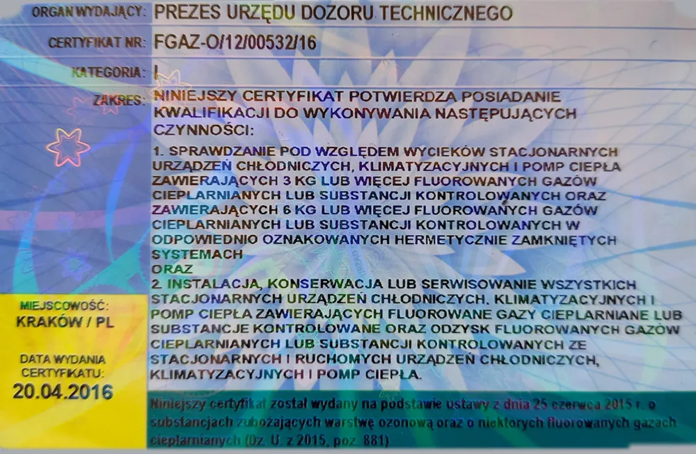 Jesteśmy autoryzowanym serwisem w zakresie sprzedaży, montażu i serwisu urządzeń klimatyzacyjnych i chłodniczych firm LG, Samsung, AUX, Gree w zakresie serwisu i sprzedaży urządzeń chłodniczych. Posiadamy wszystkie potrzebne certyfikaty i świadectwa do prowadzenia tej skomplikowanej działalności, także dokumenty uprawniające do obrotu substancjami kontrolowanymi (utylizacja czynników chłodniczych).